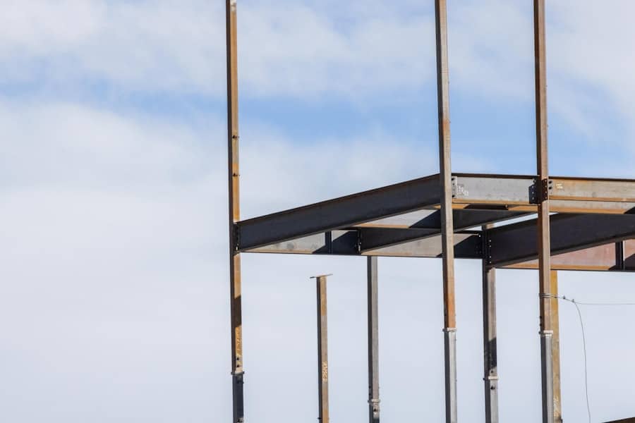 Un operaio edile con un giubbotto di sicurezza e un casco Cila ROma è in piedi su una trave di acciaio nel cantiere. L'operaio è sollevato, incorniciato da un cielo parzialmente nuvoloso. Impalcature e teli di plastica si estendono sotto di lui.